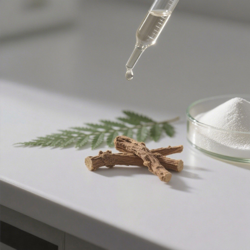 Glycyrrhiza glabra from regenerative farms in Xinjiang (pesticide-free, soil-to-vial blockchain tracking).